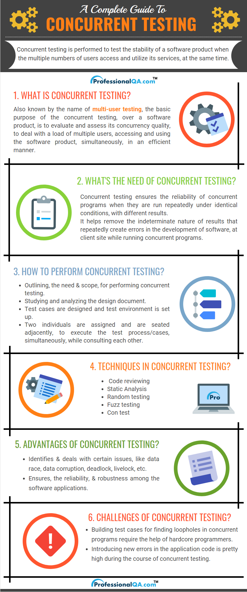 Concurrent testing is performed to test the stability of a software product when the multiple number of users access and utilise its services, at a same time. This helps in getting a rough idea of the problems arising out of multiple usages such as increased response time, crashes, deadlocks and throughputs. Also known by the name of multi-user testing, the basic purpose of carrying out the concurrent testing, over a software product, is to evaluate and assess its concurrency quality, so as to deal with the load of multiple users, accessing and using the software product, simultaneously, in an efficient and effective manner.